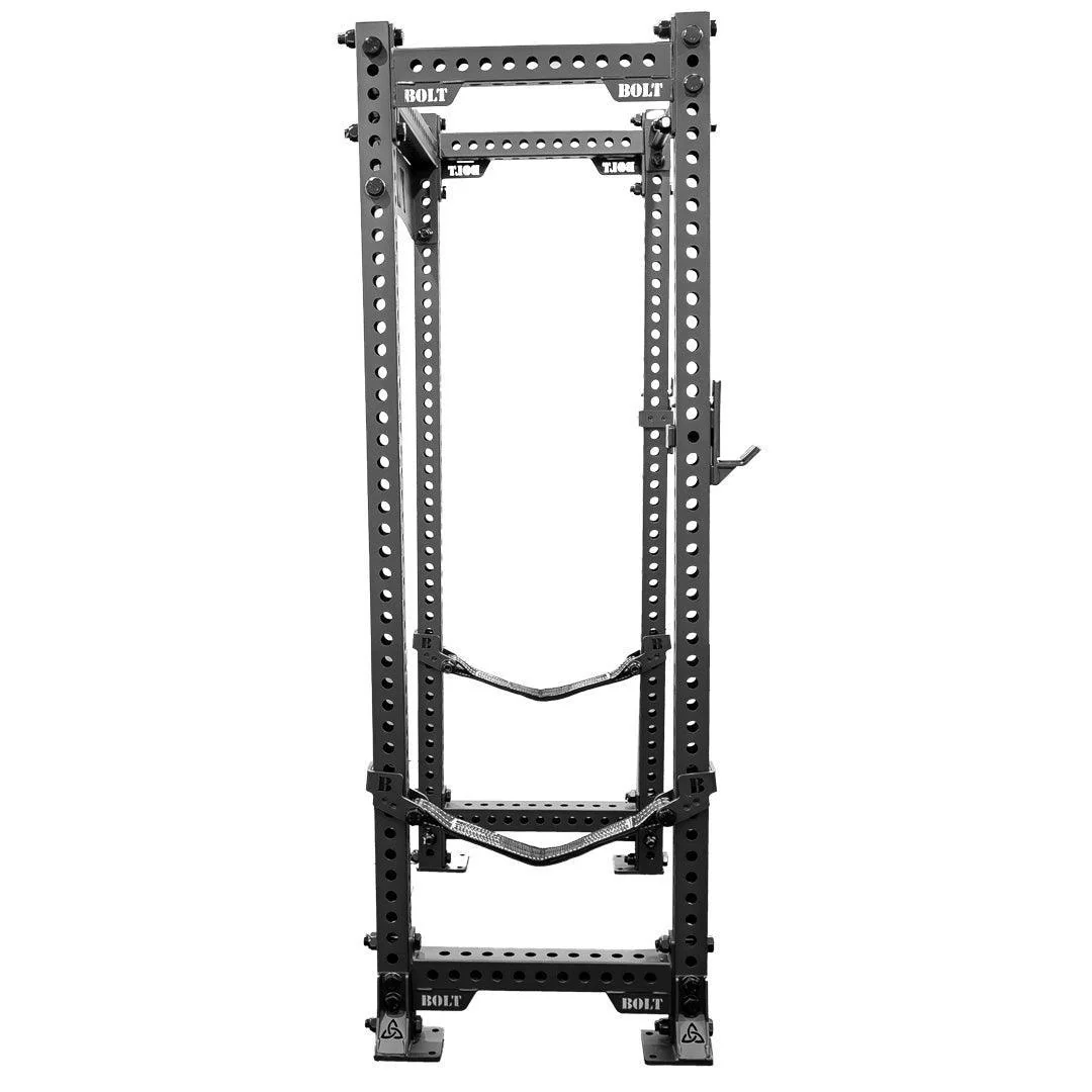 Leading the Storm Series line of racks and rigs we find the NITRO, a state-of-the-art weight rack made with 11-gauge, laser-etched, powder-black steel beams. Standing in the Nitro, you reach out your arms to the left and right and find that you have 43 inches of space, more than enough room to perform most barbell exercises. It’s a rack designed for home gym owners who do not have enough space for a standard full rack but want one anyway. The Nitro’s uprights are connected one to the other by a BOLT nameplate and a 1.5-inch thick pull-up bar. All Nitros ordered through our website or purchased at our warehouse in Houston come with two J-hooks, each rated at 440 lbs., and our signature BOLT safety straps, so you can attempt your next PR in safety.